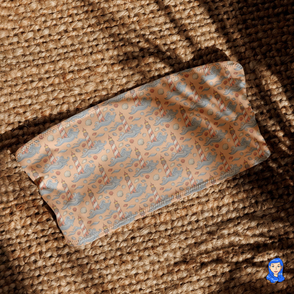 Make a splash with a blend of vintage charm and modern sustainability. This strapless bandeau bikini top features a playful, all-over nautical print of lighthouses, waves, and seashells set against a warm sandy-beige backdrop.